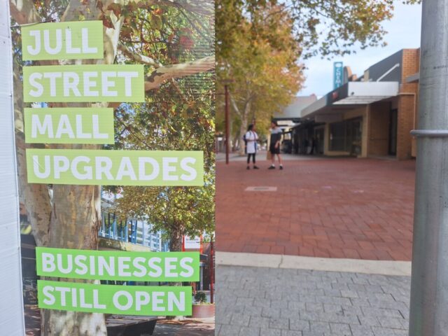 ‘What’s Happening in the Jull Street Mall’ signs placed at either end of the much-maligned pedestrian thoroughfare are the only visual indication that the project is still forging ahead.